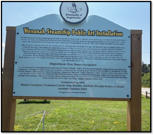 A standout feature of the project is the commemorative plaque for the Steamship Chainsaw Carving, honoring the historical significance of steamships on the Magnetawan River and enhancing heritage tourism. Strategically located at key points—including waterfalls, trails, parks, and the Village Green near Centennial Beach—the new signage connects visitors to attractions, amenities, and local businesses, drawing foot traffic into the downtown core.