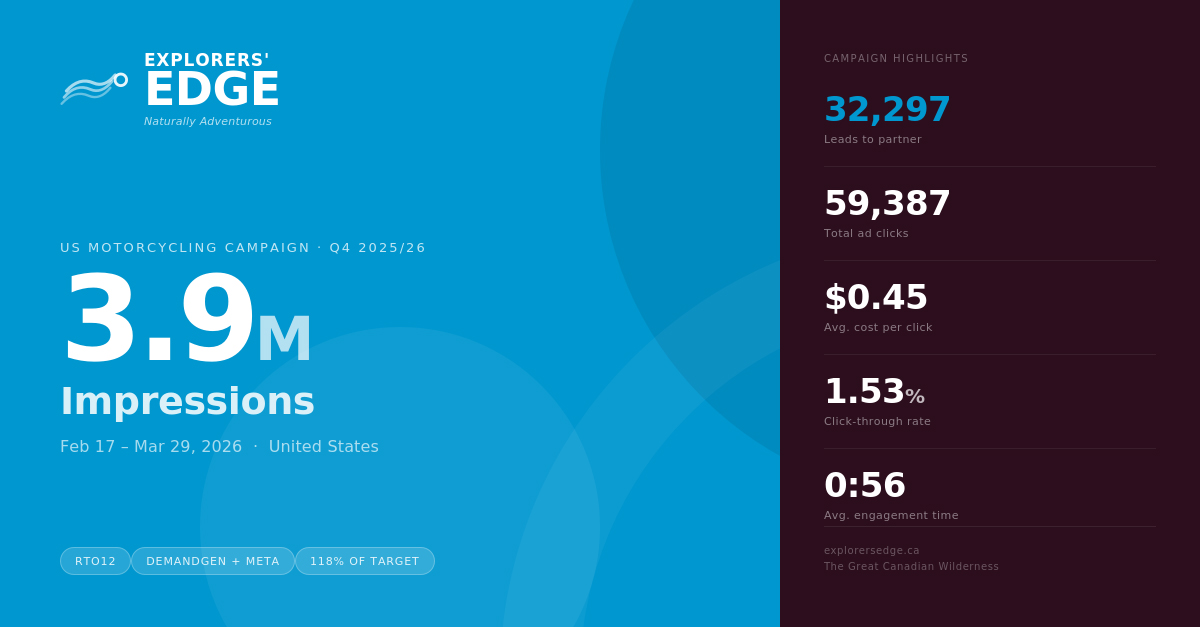 Running from February 17 to March 29, 2026, the campaign targeted riders in Michigan and New York, two key U.S. drive markets with strong potential for cross-border travel into Ontario. With support from Nick Pedota and Claude Aumont, the initiative placed Explorers’ Edge in front of riders already dreaming about their next touring adventure.